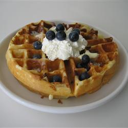 Waffles...hmmm. Here's a trick when making fruit filled waffles: when pouring the batter into the waffle-iron, make a swirl, sprinkle the fruit, then swirl some more batter on top. This way, the fruit won't sink to the bottom, and in this case, the blueberries won't dye the batter an unappetizing green color if using frozen berries. Enjoy :)